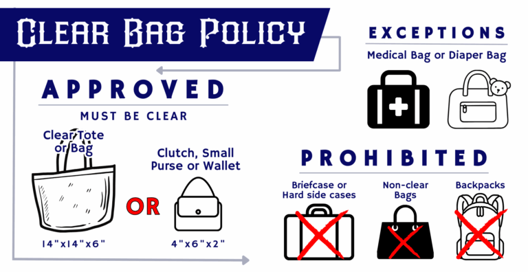 Clear Bags: Each fan may enter with ONE clear bag that does not exceed 14" in width, 14" in height, and 6" in depth. This includes clear plastic, vinyl, or PVC bags. Clutches/Purses/Wallets: Fans may also carry a non-clear small clutch/purse/wallet no larger than 4"x6"x2".